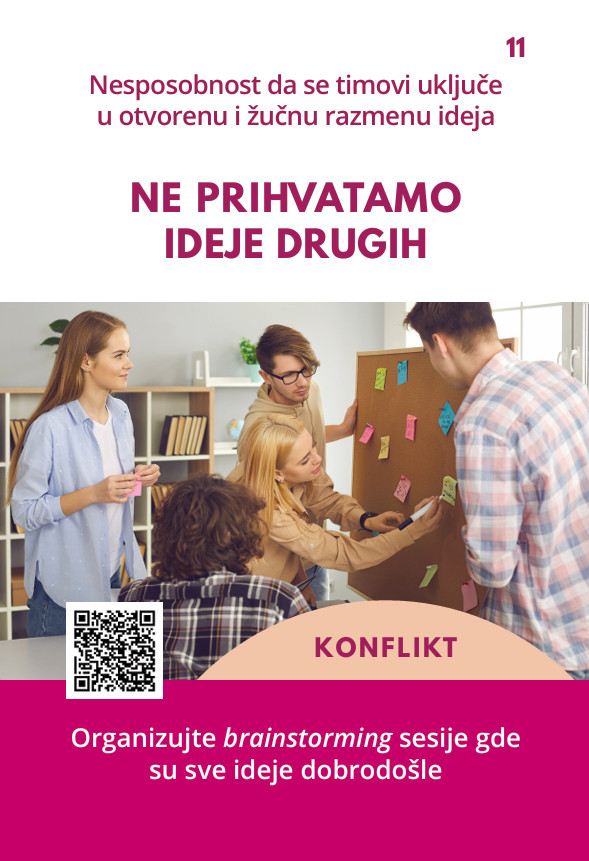 - Brzo odbacivanje predloga – pre nego što se ideja razmotri, odmah se kaže „ne“, „to neće raditi“ ili „to smo već probali“.