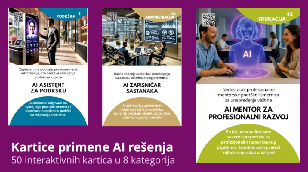 Ovaj trening pruža praktičnu primenu AI alata, uz rad na specijalizovanim AI karticama koje na jednostavan način povezuju poslovne izazove sa odgovarajućim AI rešenjima.