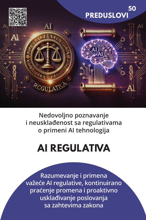 AI regulativa definiše pravila igre — gde AI može, gde ne sme, pod kojim uslovima i koje procedure su obavezne. Ako organizacija ispuni ovaj preduslov, AI implementacija postaje pravno sigurna, predvidljiva i dugoročno održiva. EU AI Act i GDPR zahtevaju transparentnost, bezbednost, dokumentaciju, ljudski nadzor i minimizaciju rizika. Usaglašenost sa regulativom omogućava kompaniji da koristi AI rešenja bez opasnosti od kazni, sudskih postupaka ili gubitka poverenja kupaca.