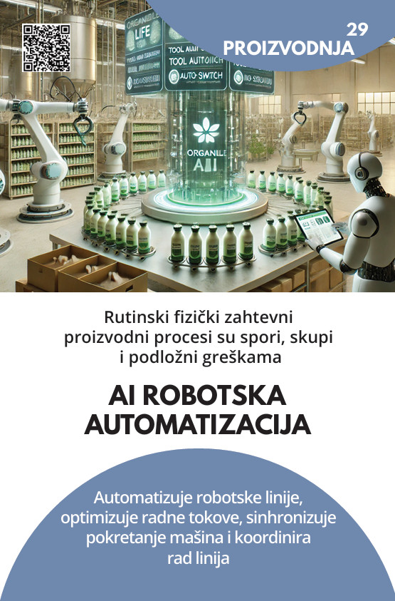 AI robotski sistemi koriste kompjutersku viziju, senzore, prediktivnu analitiku i autonomno upravljanje kako bi izvršavali zadatke kao što su: sortiranje, pakovanje, komisioniranje, prenos materijala, inspekcija, montaža i paletizacija. Sistem prepoznaje objekte, optimizuje pokrete, detektuje anomalije, izbegava prepreke i samostalno se prilagođava različitim uslovima u proizvodnom okruženju. Može da radi 24/7 uz minimalnu ljudsku intervenciju.