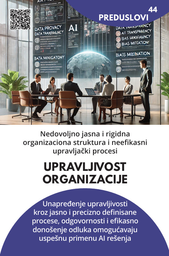 Bez jasne upravljačke – organizacione strukture AI projekti nemaju stabilne temelje. AI uvodi promene u procese, radne navike i tokove odgovornosti — što zahteva čvrst governance i jasne mehanizme odlučivanja. Kada je organizacija upravljiva, AI projekti brže napreduju, lakše se donose odluke, ubrzava se integracija tehnologije i smanjuje otpor zaposlenih. Upravljivost je ključni preduslov da se AI koristi strateški, a ne samo eksperimentalno.